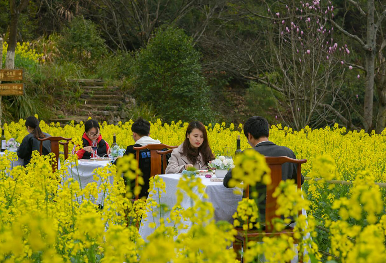 又是一年花开时,三月菜花遍地黄。江西省上饶市婺源县篁岭景区的梯田花海进入了最佳观赏期,漫山遍野的油菜花如金色的海洋般席卷大地。篁岭景区也别出心裁推出了“花海餐厅”定制服务。